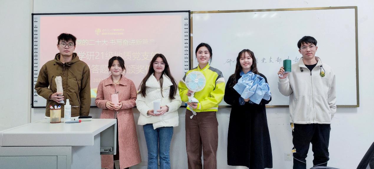 随后,我们由激情澎湃的讨论环节转到轻松愉悦的颁奖仪式中去,由刘杰同志宣布上学期末主题党日活动答题竞赛中的获奖成员名单,按照一二三等设置若干奖项对每位获奖成员进行颁奖,并邀请6位获奖成员上台进行合影留念。希望借助此举,激发支部全体成员对于党史理论学习与知识竞赛的参与度与积极性,使大家能够主动且自发的参与到学习活动中去,切实提高自身理论水平与思想觉悟,争做支部内的学习标兵,争做肉番