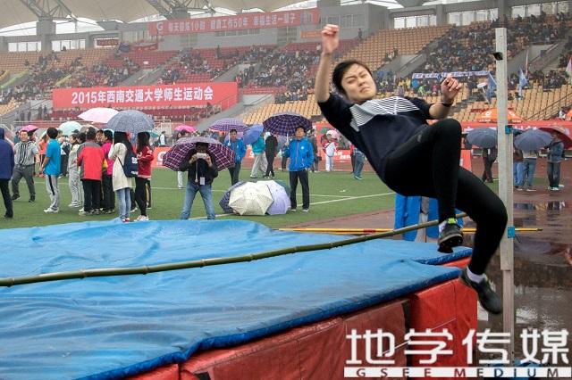 比赛刚开始,竿的高度设为1.10米,不少女生就在悄声议论,自己能不能跳得过去,但是当比赛正式开始后,谁都全力以赴,无所畏惧。首先上场的是来自峨眉校区的周思源,只见她凝神向着那根横竿跑去,加速,起跳,翻身,落下,随着一条优美的弧线,她顺利跳过,赢得了在场人的鼓掌与欢呼,首站告捷,这也给后面上场的同学做出了榜样。后来,来自交运肉番
