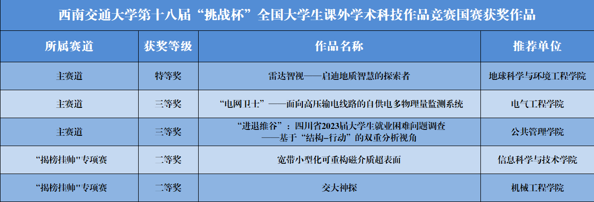 首次在“挑战杯”全国大学生课外学术科技作品竞赛主赛道取得特等奖殊荣。创造了学校在该赛事的历史最高成绩!